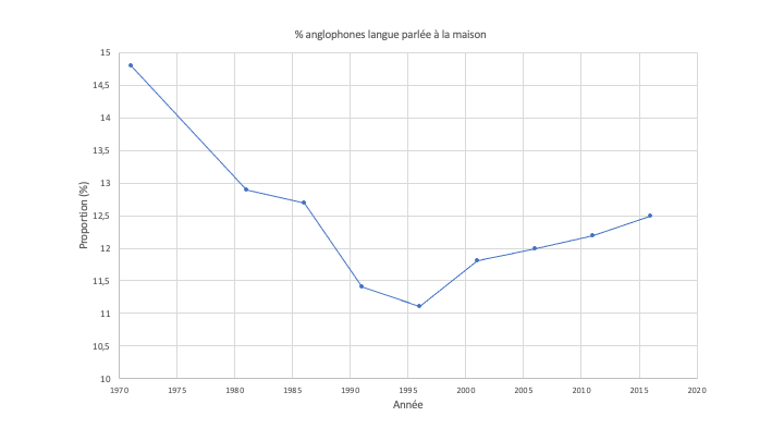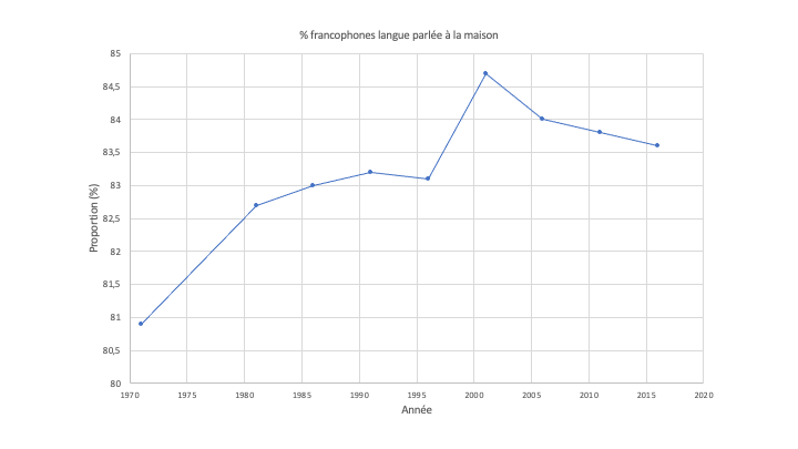 On peut noter d’abord la très grande variabilité des données due au fait que Veltman amalgame les réponses à la question sur « la langue parlée le plus souvent à la maison » avec celle sur « la ou les langues parlées régulièrement à la maison » des recensements, tout en ne tenant pas compte des ruptures importantes de comparabilité induites par les changements de questionnaires (à noter le bond pour 2001, par exemple). A noter aussi, qu’après le brusque et inexplicable saut de 1996 à 2001, le français décroit sans arrêt sur la période 2001-2016.