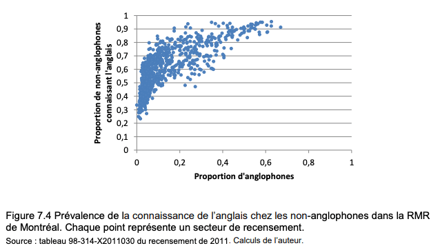 Ainsi, alors que pour l’anglais, une faible concentration d’anglophones (20%) suffit à rendre sa connaissance quasi universelle chez les allophones, ce n’est pas vrai pour le français qui a besoin d’une très forte concentration de francophones (80%) pour arriver au même résultat (voir les figures 7.3 et 7.4). Ceci est une illustration de la disproportion énorme des rapports de force entre l’anglais et le français au Canada.