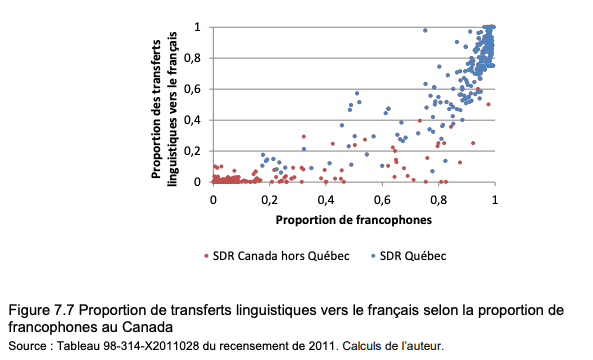 Pour contrecarrer le bilinguisme compétitif qui est au cœur de la Loi sur les langues officielles et qui est aussi le fait, malgré les dénégations, de la politique linguistique québécoise (voyez par exemple toute la question du financement de l’enseignement supérieur au Québec), un minimum de 80% (voire 90%) de francophones est requis dans une région donnée afin que les transferts linguistiques des allophones se fassent majoritairement vers le français (voir fig. 7.7).