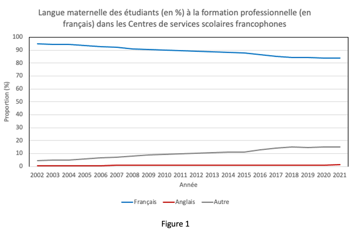 La figure 1 présente la proportion d’étudiants francophones, anglophones et allophones (« autre »), langue maternelle, inscrits à la FP dans les Centres de services scolaires de langue française au cours de la période 2002-2021