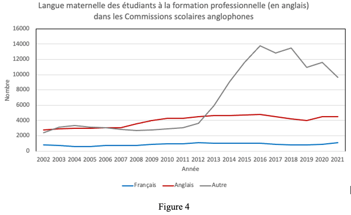 En 2021, les allophones inscrits à la FP étaient 2,2 fois plus nombreux que les anglophones (4 476 personnes). Les francophones sont également, en nombre absolu, un peu plus nombreux à fréquenter la FP en anglais, passant de 819 personnes en 2002 à 1093 personnes en 2021.