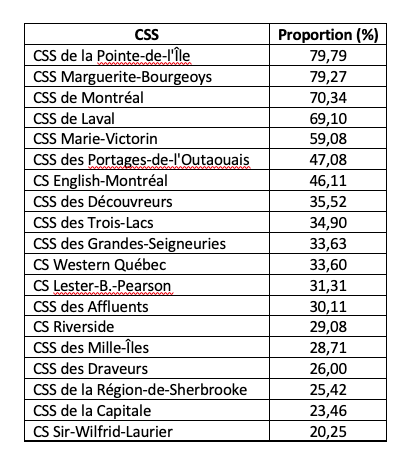 Les 5 première CSS du tableau ont toutes plus de 50% d’immigrants et représentent 20,8% de l’effectif scolaire total du Québec.