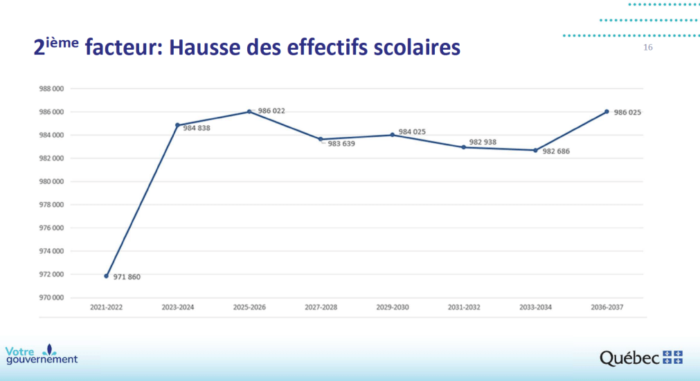 Le premier facteur responsable de la pénurie annoncée de 14 230 professeurs pour les 4 prochaines années serait les départs à la retraite (voir p. 17), suivi, en deuxième position, de la « hausse des effectifs scolaires », hausse due presque entièrement à l’immigration.