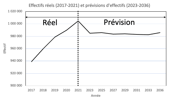 On constate, en comparant les figures 1 et 2, que l’effectif réel en 2021 (1 004 777) est supérieur à celui indiqué sur les projections pour 2023 (984 838). Il y aurait donc une baisse des effectifs de 19 939 en deux ans, alors que celui-ci monte de 13 126 par année sur toute la période précédente.