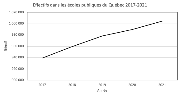 J’ai obtenu les données d’effectifs des écoles publiques du ministère de l’éducation pour la période 2017-2021 (voir figure 2). On peut constater, à la figure 2, que l’effectif est passé de 939 144 en 2017 à 1 004 777 en 2021, soit une croissance de 65 633 élèves en 5 ans seulement.