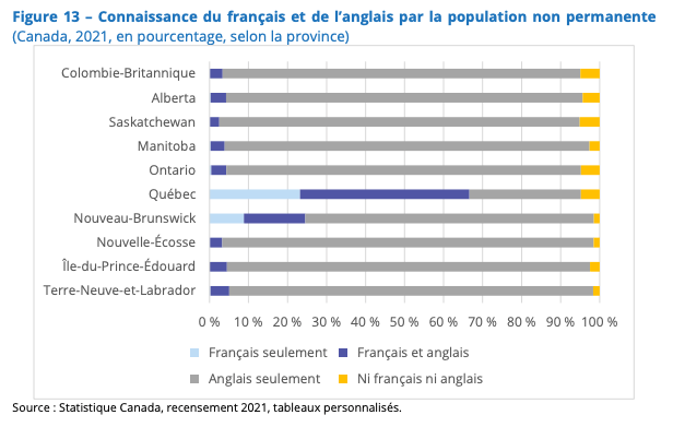 L’on constate à la figure 13 qu’ailleurs qu’au Québec (et au Nouveau-Brunswick), quasiment tous les immigrants temporaires (95%) connaissent l’anglais et que très peu connaissent le français (5% ou moins). La situation est toute autre au Québec où 28,6% des immigrants temporaires connaissent seulement l’anglais tandis que 43,4% connaissant l’anglais et le français. Le commissaire résume pudiquement la chose ainsi (p.81): « nous pouvons affirmer que la plupart des personnes immigrantes connaissent l’anglais avant leur arrivée au Canada, hormis celles qui veulent s’installer au Québec et au Nouveau-Brunswick. En effet, si elles apprenaient l’anglais seulement après leur arrivée au Canada, nous observerions un pourcentage beaucoup plus élevé de personnes qui ne le maîtrisent pas. Or, ce n’est pas le cas. Par ailleurs, en dehors de ces deux provinces, la connaissance généralisée de l’anglais n’est pas surprenante. En effet, elle est habituellement nécessaire pour trouver un emploi ou être admis dans un programme d’études, soit les deux principales manières d’obtenir un statut d’immigration temporaire au Canada. Au Québec, seule une faible partie des personnes immigrantes ne maîtrise ni le français ni l’anglais. Comme dans les autres provinces canadiennes, les personnes qui y immigrent acquièrent avant leur arrivée les connaissances linguistiques qui leur permettront d’y travailler ou d’y étudier. Le Québec se distingue néanmoins par le fait que les personnes immigrantes peuvent y travailler ou étudier en français ou en anglais. Ainsi, une part importante de l’immigration temporaire s’installe au Québec dans le but d’y travailler ou étudier dans la langue de la minorité linguistique, alors qu’une telle situation n’existe pas ailleurs au Canada (à l’exception, mais dans une mesure moindre, du Nouveau-Brunswick) ».